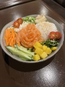 Lax med sushiris, olika grönsaker toppad med chilimayo och teriyakisås